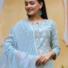 Look stylish and make a statement with the Cotton Blue Ethnic Motifs Printed Straight Kurta Palazzo Dupatta Set. This set features a stunning straight calf-length kurta with a keyhole neck, three-quarter sleeves, and side slits. It is printed with beautiful floral motifs that will add a unique charm to your ensemble. Paired with a matching palazzo and dupatta to complete the look, this set will be a timeless addition to your wardrobe.